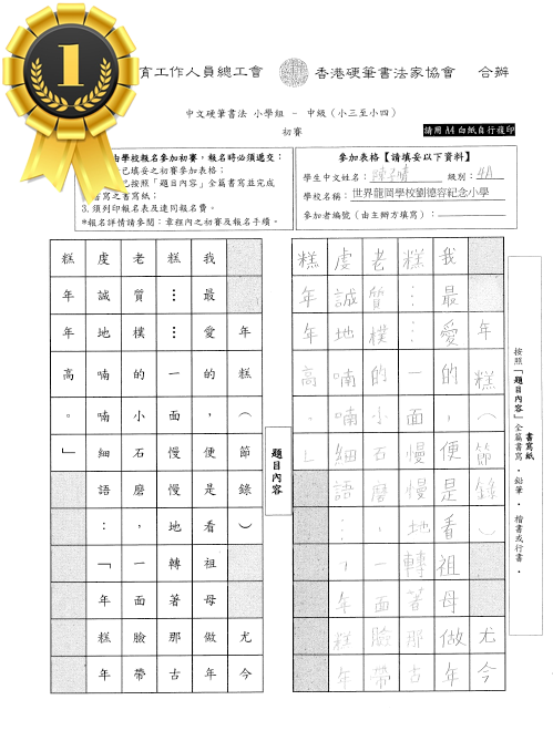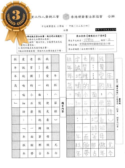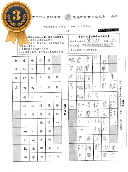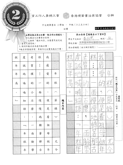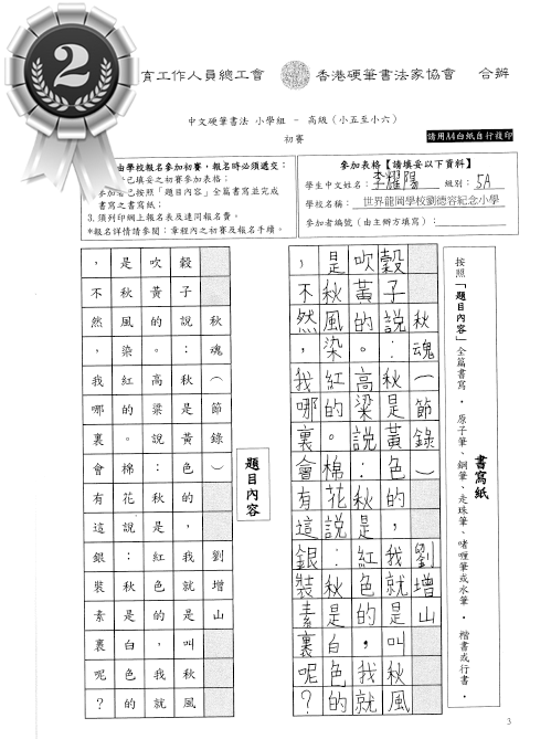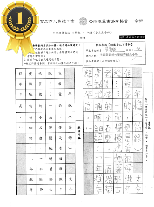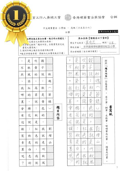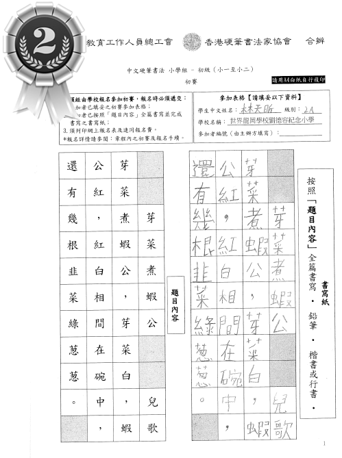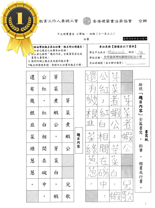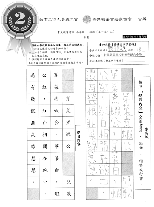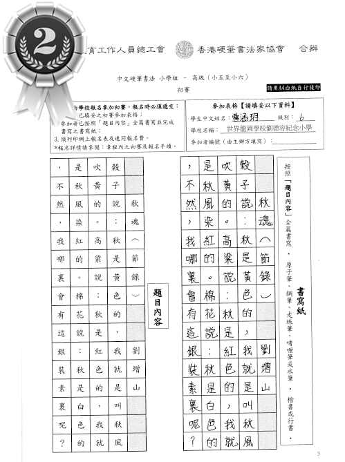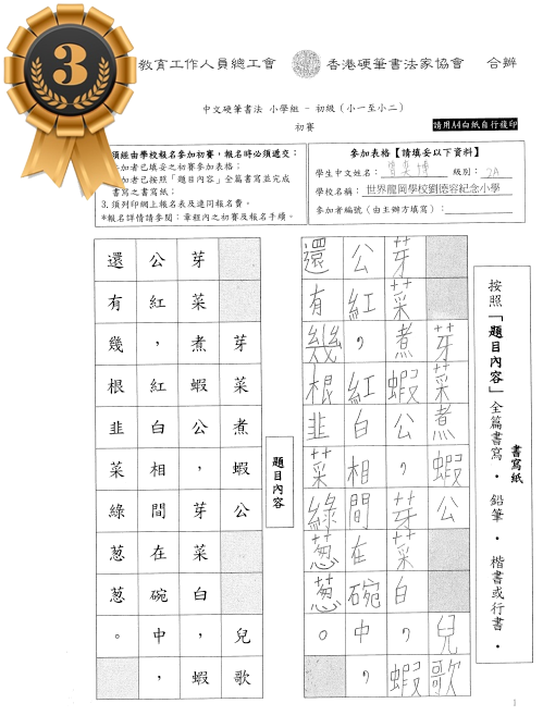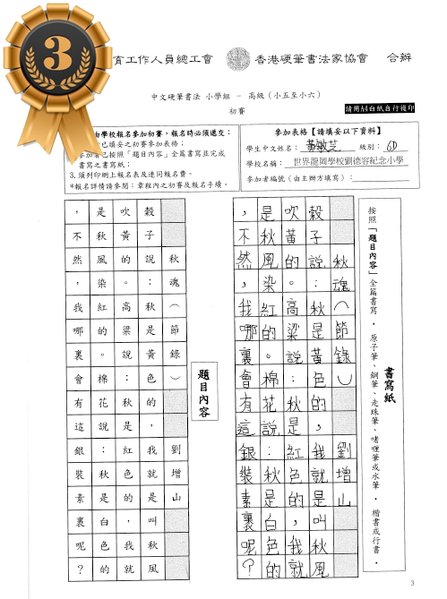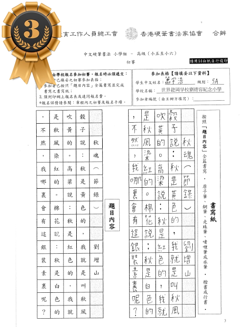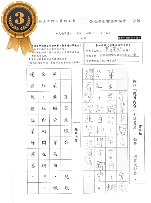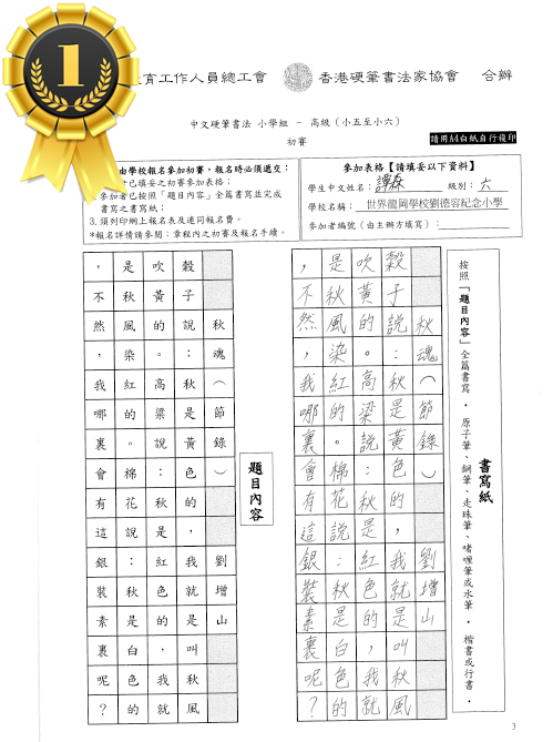 本校中文科於十月份舉行了班際書法比賽,恭喜以下同學獲獎: